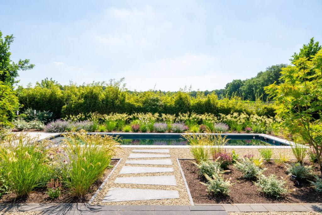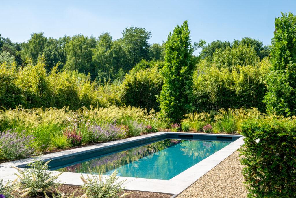De beplanting loopt tot aan de boordstenen, waardoor het zwembad opgaat in de omgeving. Zo ontstaat een zachte overgang tussen tuin en water, met een vleugje luxe in natuurlijke eenvoud.