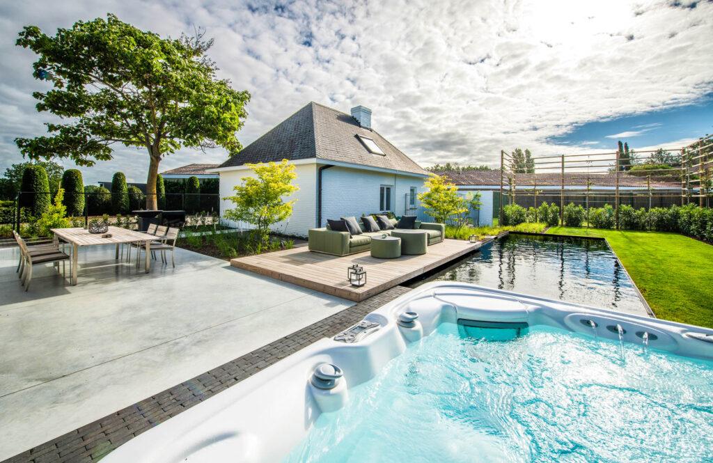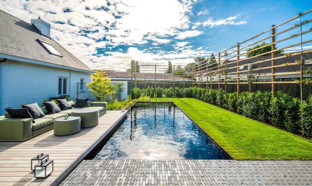 Deze tuin is een perfect voorbeeld van moderne tuinaanleg waarin zwembad, terras en buitenleven naadloos in elkaar overvloeien.