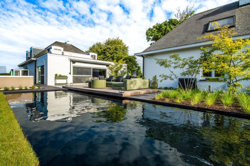 In deze exclusieve tuin staat een zwart design zwembad centraal. Het zwembad heeft de uitstraling van een zwemvijver, maar biedt het comfort en de luxe van een modern zwembad. Door de zwarte kleur ontstaat een stijlvol, spiegelend watereffect dat de tuin een bijzondere sfeer geeft.